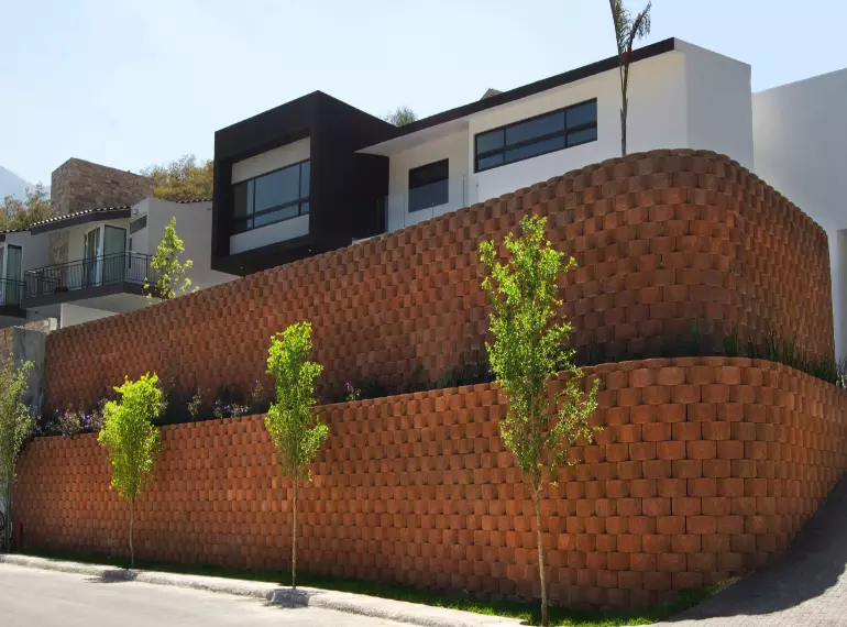 Esta residencia ubicada en un sector privado al sur de la ciudad de Monterrey, requirió de la construcción de 2 muros con diferente nivel. Ambos muros delimitan la propiedad y permiten el aprovechamiento al máximo de la superficie del terreno. Para su relleno, hicimos uso de la tierra procedente del cerro y creamos una plataforma que tiene un jardín con alberca en la parte superior. En la parte inferior, colocamos una jardinera que le brinda una vista llena de vida natural y se integra al diseño espectacular de la edificación.